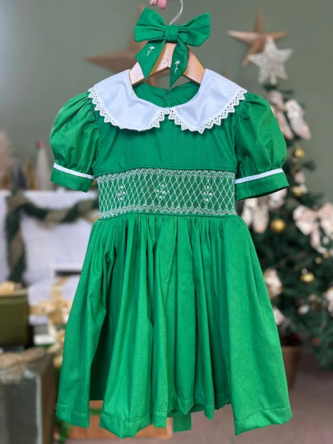 O destaque fica por conta do bordado colmeia, feito totalmente à mão, com cada detalhe cuidadosamente trabalhado — é uma verdadeira obra de arte que leva tempo para ficar perfeita, mas o resultado é simplesmente encantador!